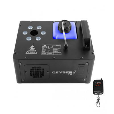 Es una maquina de humo  que proporciona ráfagas de energía luminosa a cualquier evento con efectos que simulan a la pirotecnia. Sus 6 LEDs RGB iluminan las potentes columnas de humo generadas con fluido a base de agua. El avanzado sensor de bajo nivel protege la bomba de un sobrecalentamiento. Compacto y ligero, Geyser T6 es perfecto para aplicaciones móviles.
